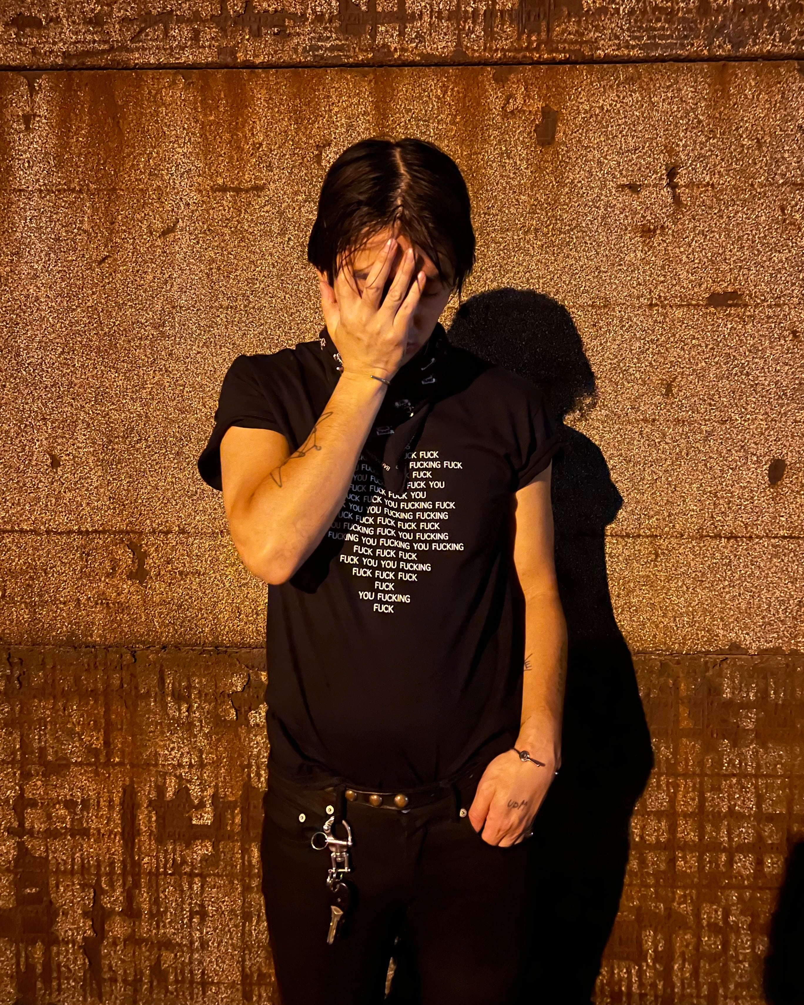 SHAKE JUNZIによるチャーミングなポエムがプリントされている。インスピレーション源は映画「ドラゴンタトゥーの女」のリスベットが着ていたTシャツから。